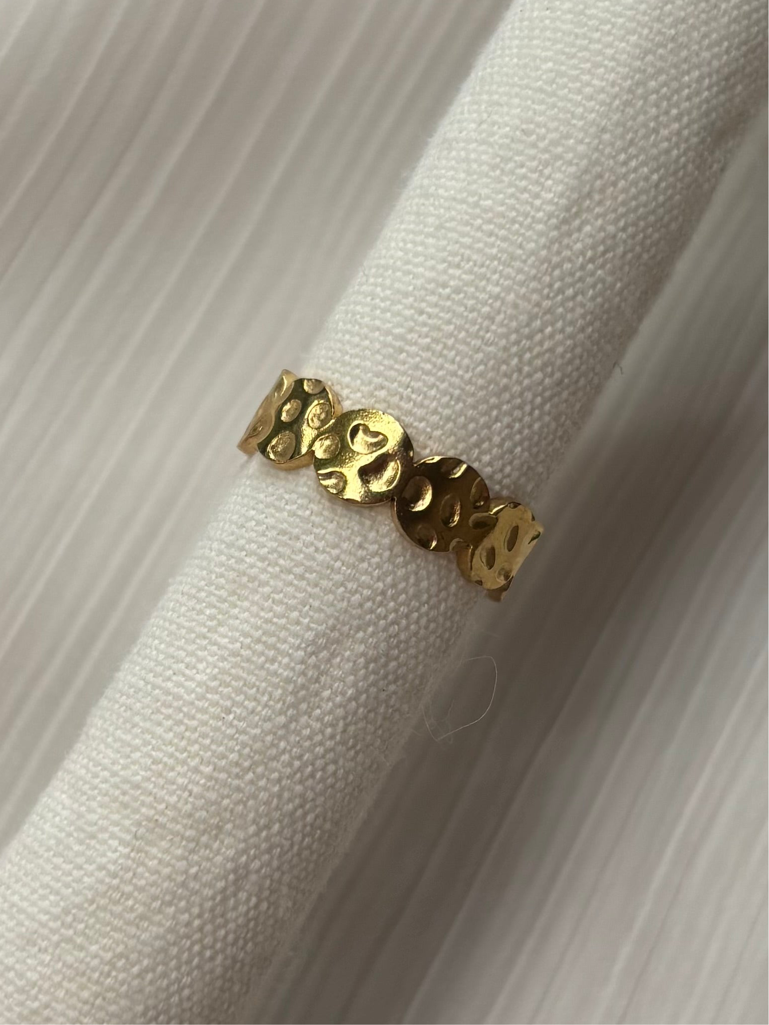 Composée de petits ronds aux formes irrégulières et finement martelées, cette bague évoque à la fois la matière brute et la délicatesse du travail manuel. Une pièce subtile mais pleine de caractère. Idéale pour faire des accumulations de bagues.