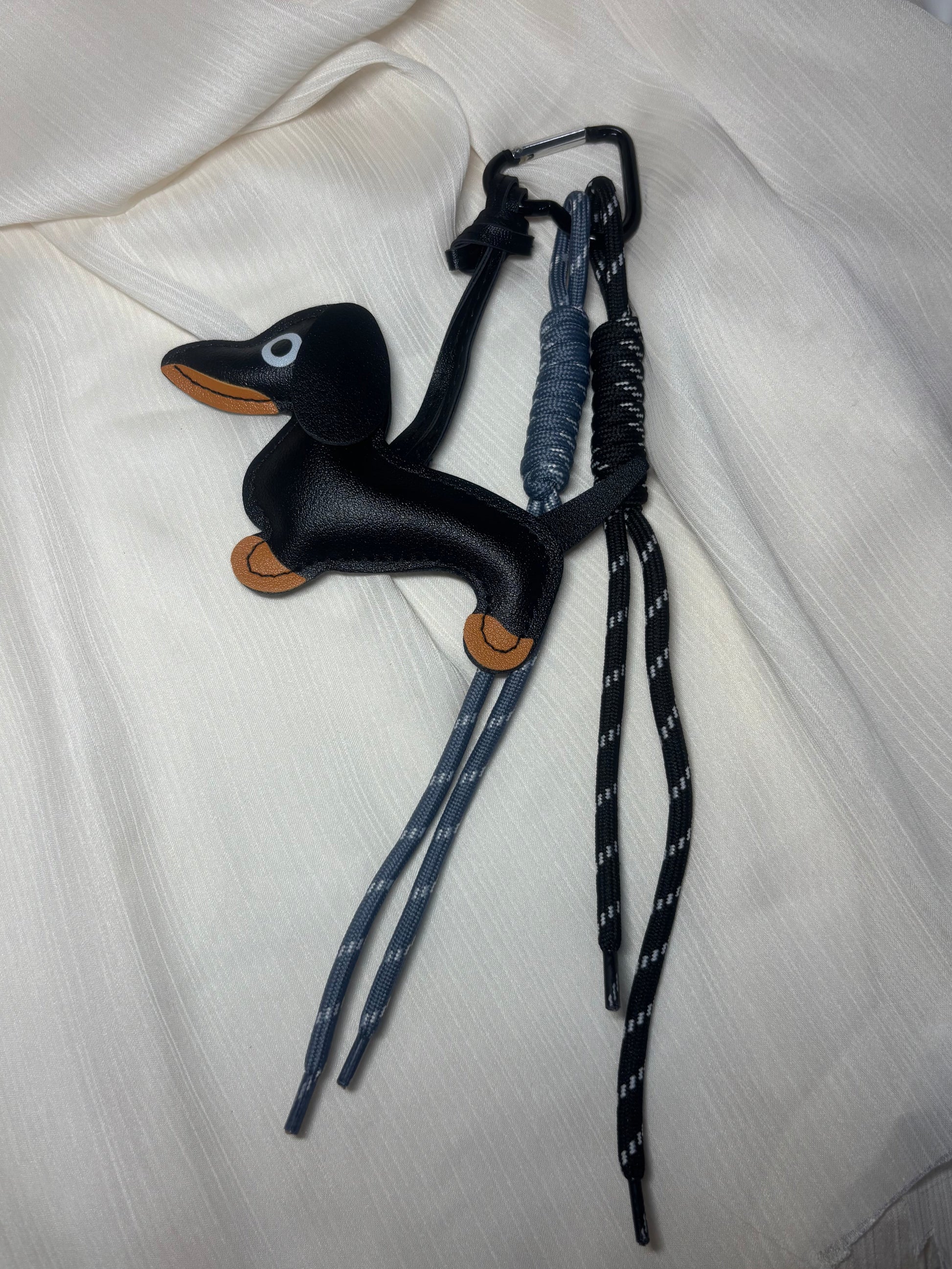 Voici le grigri dont tu ne vas plus pouvoir te passer : un porte clé avec un petit teckel en simili cuir noir ultra stylé, accroché à des cordelettes et monté sur un mousqueton noir en forme de cœur. C’est fun, c’est mode, c’est le détail qui fait toute la diff.