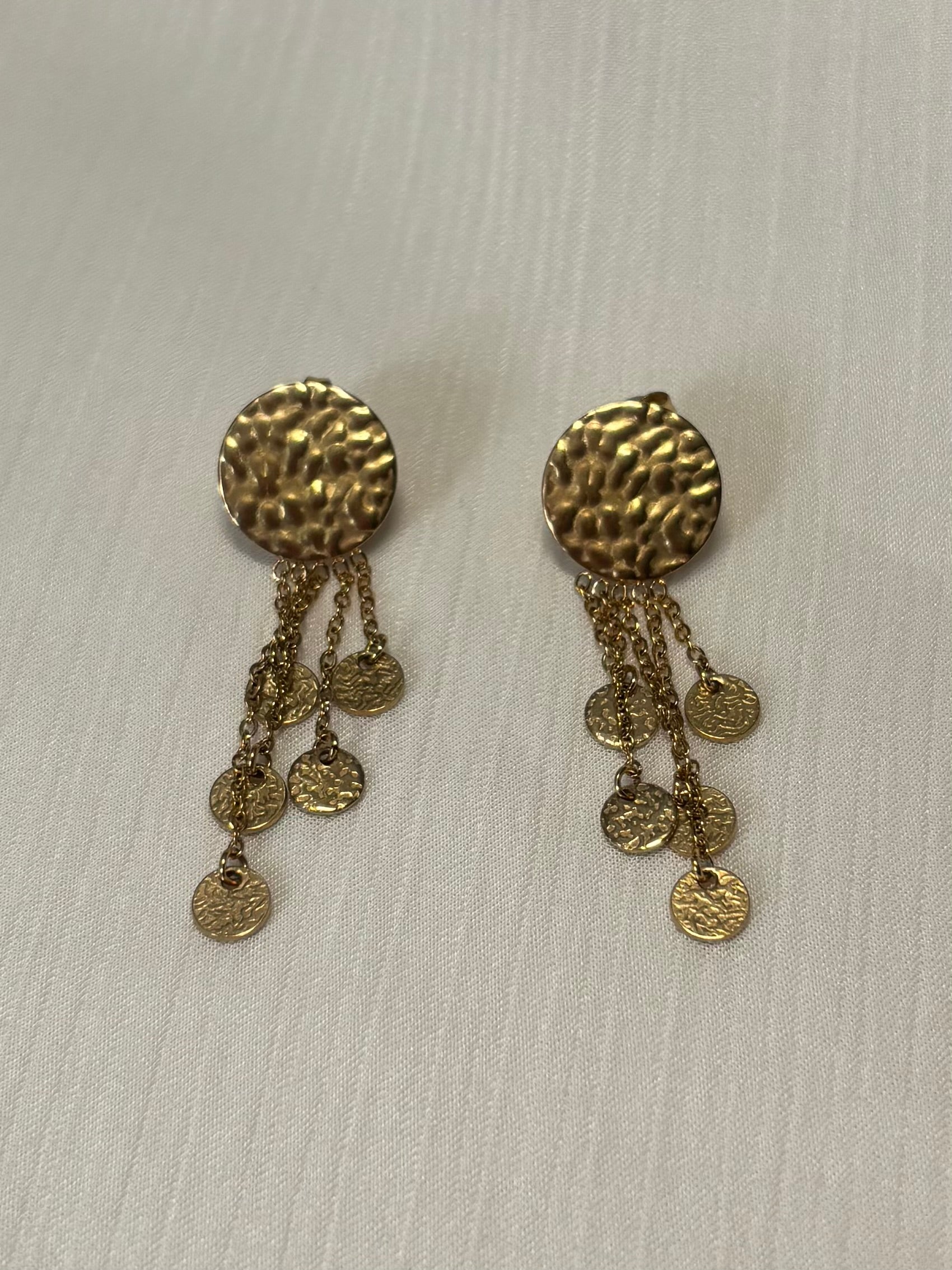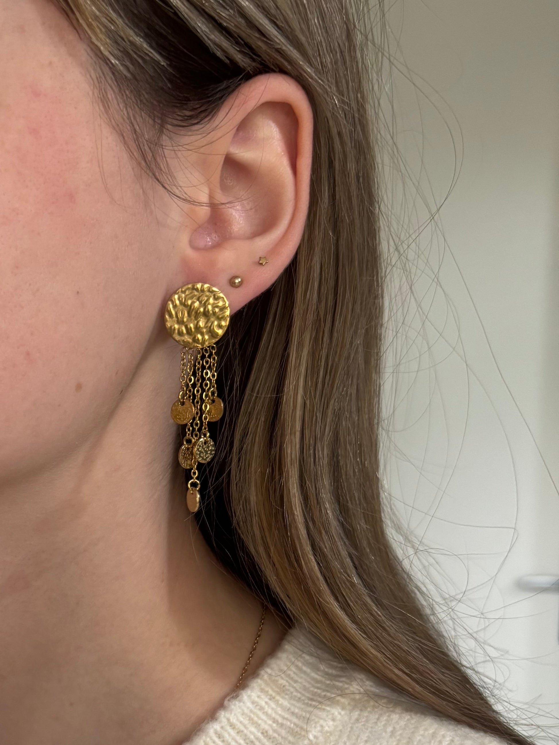 Leur partie supérieure au fini métal martelé reflète la lumière avec subtilité, tandis que plusieurs chaînettes fines se terminent par de petites médailles dorées texturées.