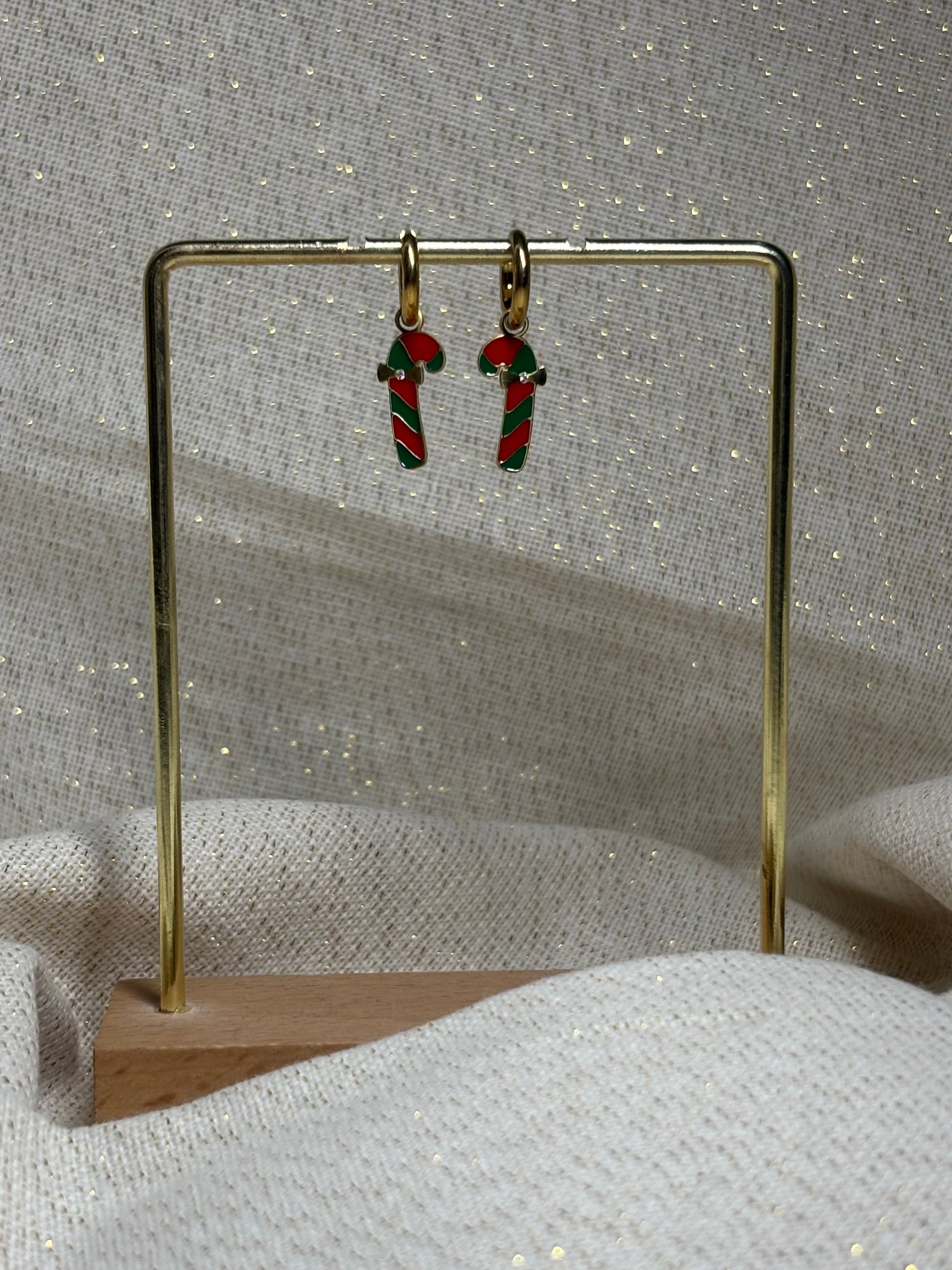 Ajoutez une touche de magie à vos fêtes avec ces petites créoles ornées de pendentifs de Noël en forme de sucres d'orges rouge et vert. Légères et élégantes, elles subliment vos tenues tout au long du mois de décembre. Parfaites pour offrir ou pour se faire plaisir !