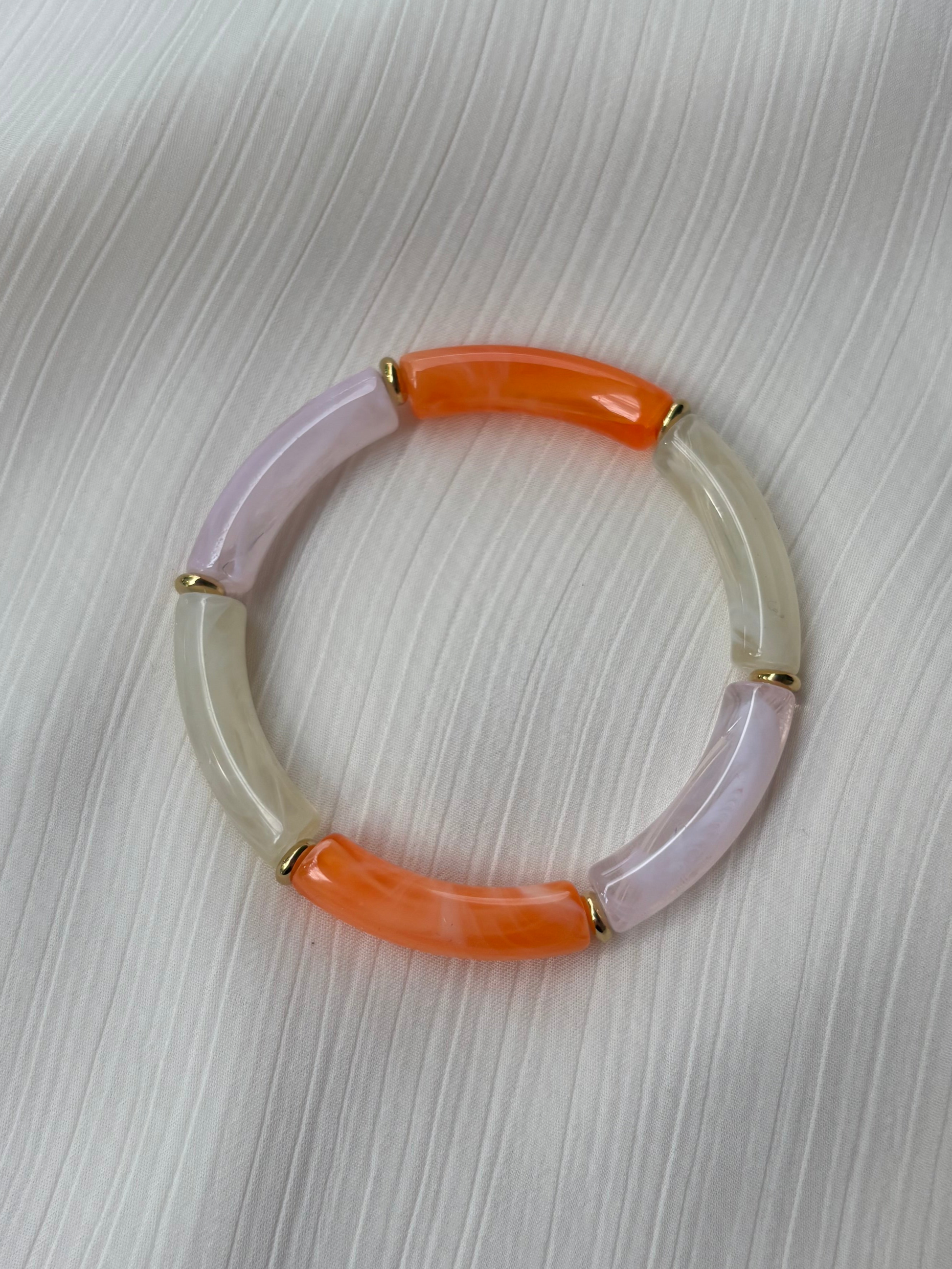Apportez une touche de fraîcheur et d’originalité à votre look avec ce bracelet composé de segments en résine colorée. Ses nuances douces de lilas et d’ivoire se marient parfaitement avec l’énergie vibrante du corail et de l’orange, créant un bijou à la fois élégant et pétillant. Les séparateurs dorés ajoutent une note raffinée qui rehausse l’ensemble.