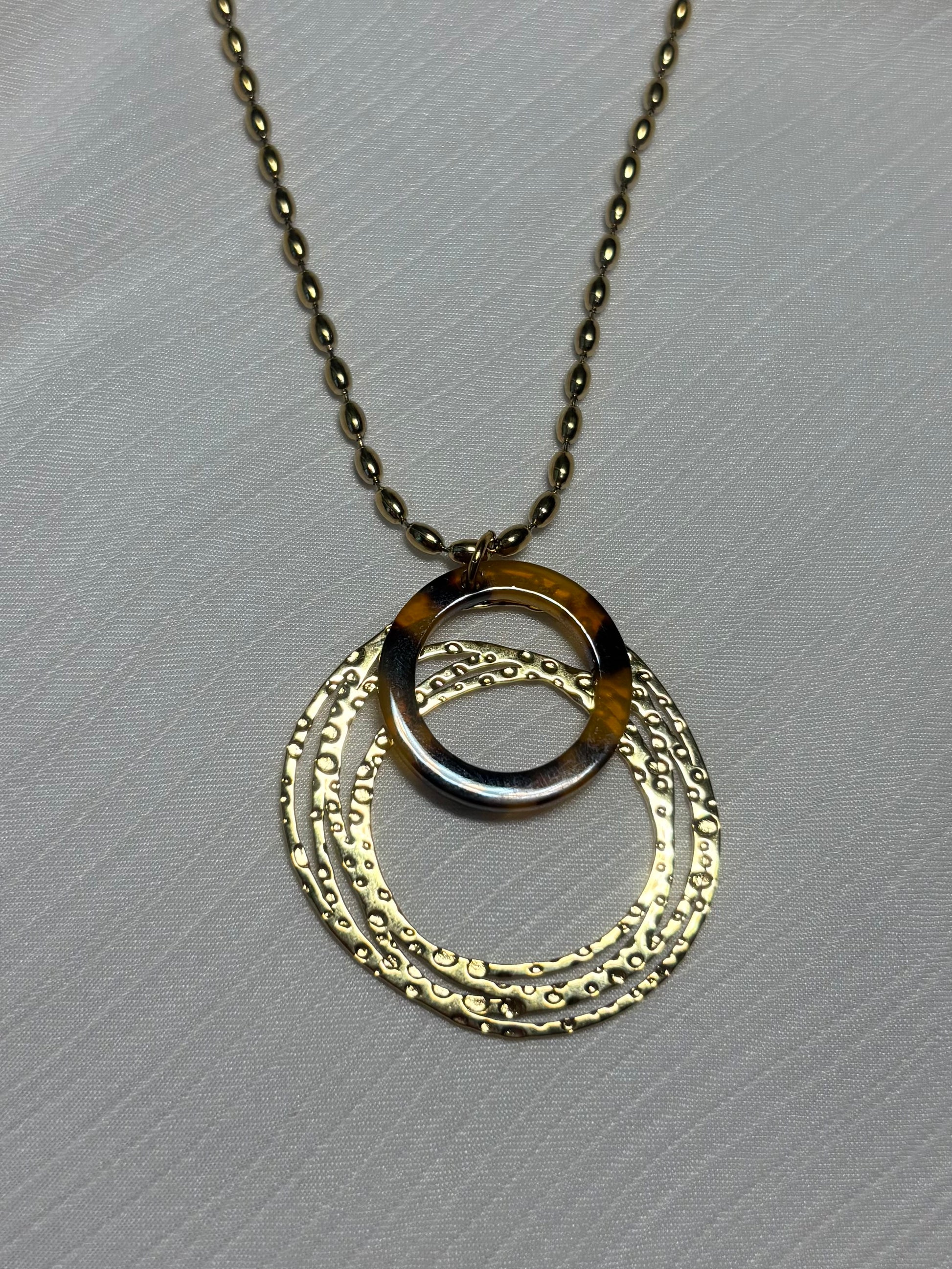 Adoptez un style chic et moderne avec ce collier doré orné d’un pendentif composé d’anneaux entrelacés. L’association de l’anneau effet écaille de tortue et des cercles dorés martelés crée un contraste raffiné et tendance. Ce bijou audacieux sublime aussi bien un décolleté habillé qu’un look casual, apportant une touche d’élégance à toutes vos tenues.