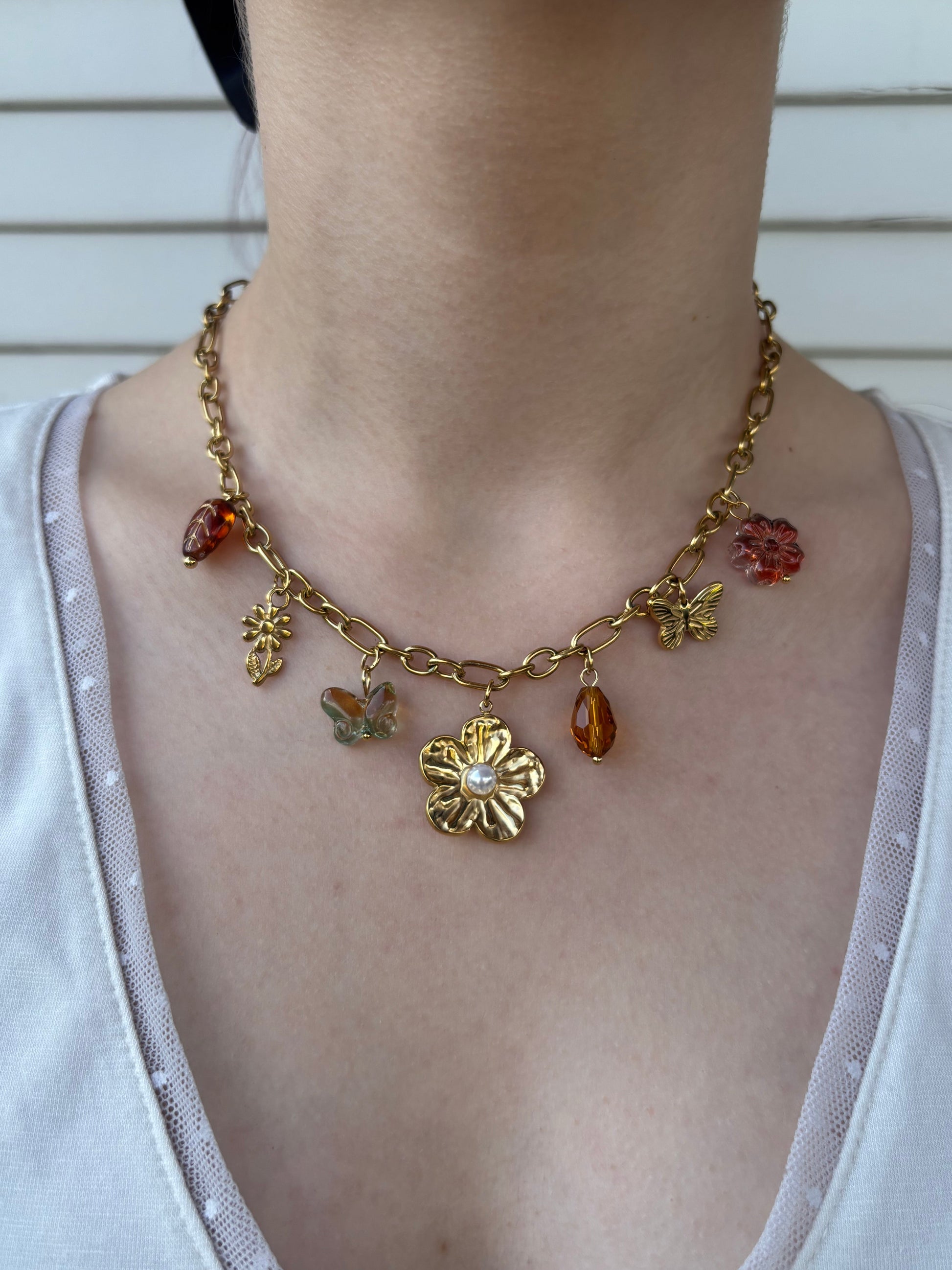 Orné de charms floraux et de papillons. La chaine est sublimée par une grande fleur centrale sertie d'une perle, accompagnée de détails ambrés et translucides qui capturent la lumière avec douceur. Un bijou élégant, parfait pour rayonner au quotidien.