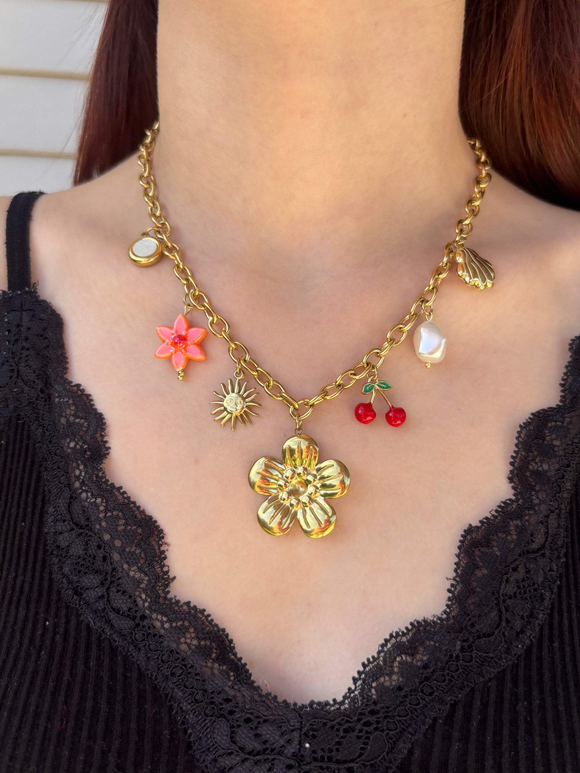 Le collier Riviera Pop est un bijou "statement" qui capte l’esprit d’un été éternel. Sa grosse fleur dorée au centre attire tous les regards, accompagnée de charms éclatants et ludiques : cerises, coquillage, perle, fleur tropicale, soleil rayonnant… Une pièce joyeuse et expressive, idéale pour les amoureuses de la mode colorée et audacieuse.