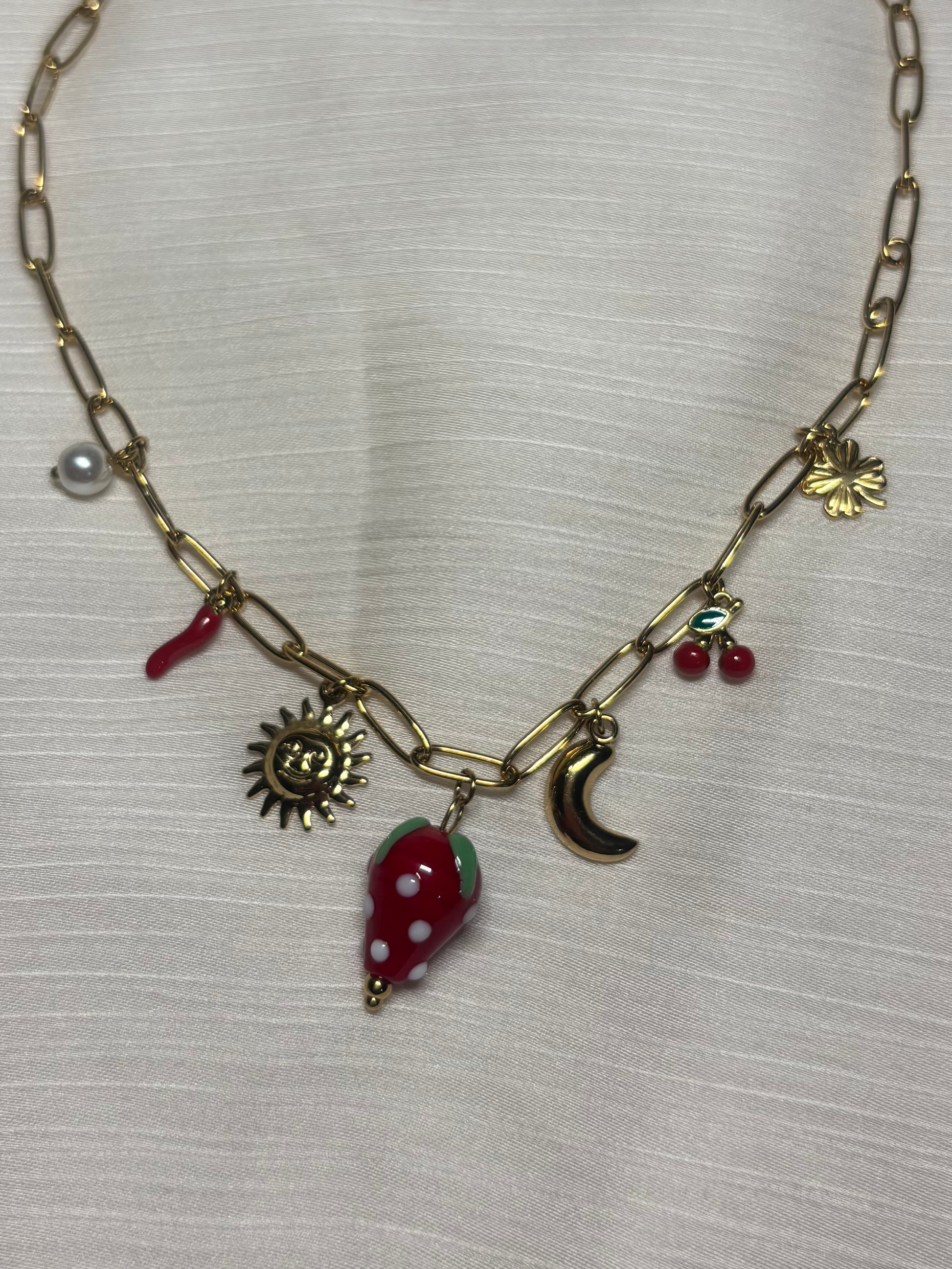 Coloré, audacieux et joyeux.. Orné de charms symboliques et fruités — fraise en verre soufflé, cerises, soleil, lune, trèfle, piment porte-bonheur et perle — ce collier insuffle fraîcheur et personnalité à toutes vos tenues. C’est le bijou parfait pour affirmer un style rétro, pop ou bohème avec une touche de magie méditerranéenne.