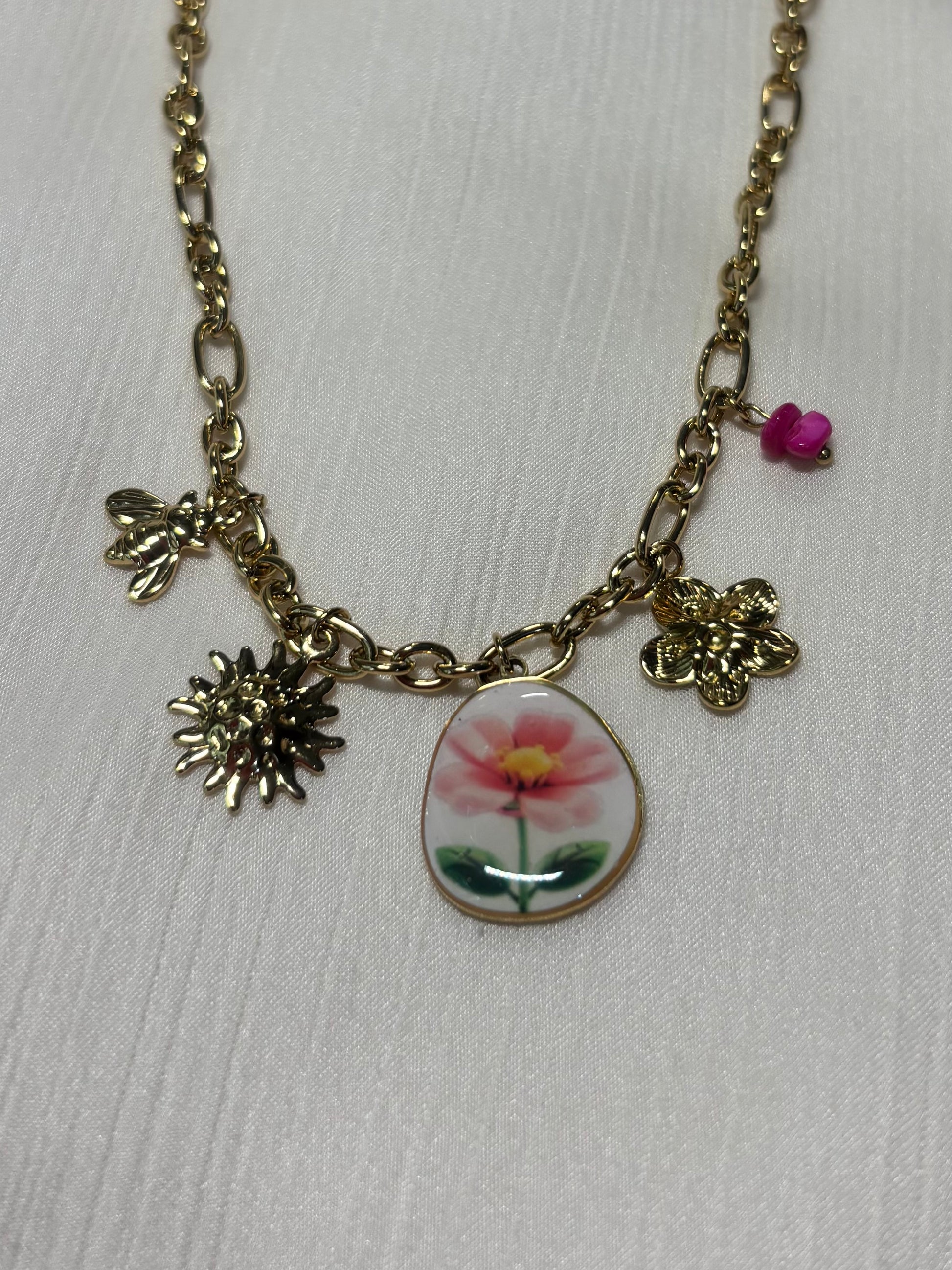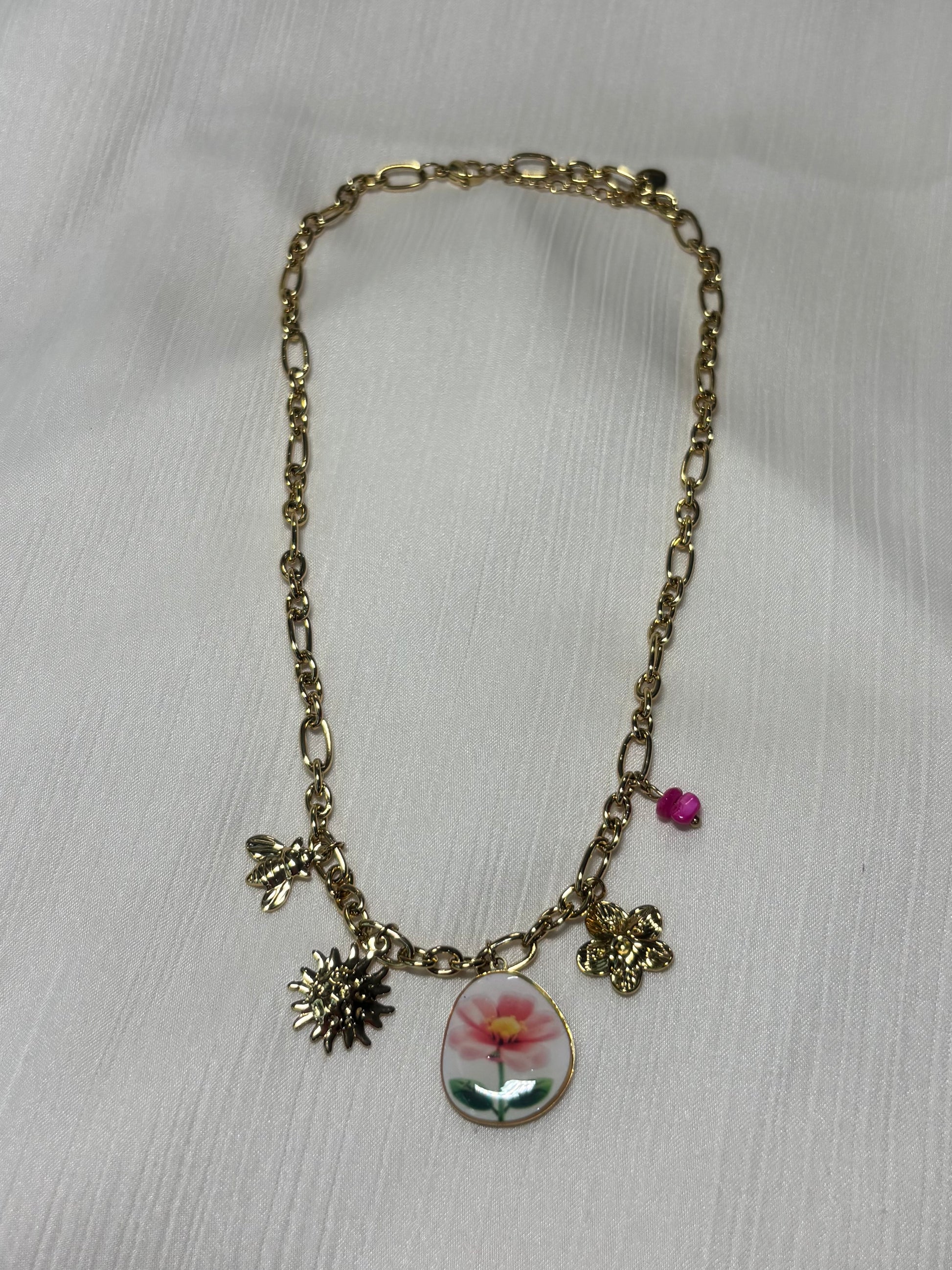 Laissez-vous séduire par la poésie de la nature avec ce collier doré orné de breloques florales et champêtres. Le pendentif central en porcelaine évoque la douceur d’un jardin au printemps, entouré d’un soleil doré, d’une abeille et d’une fleur en relief. Collier à gros maillons.