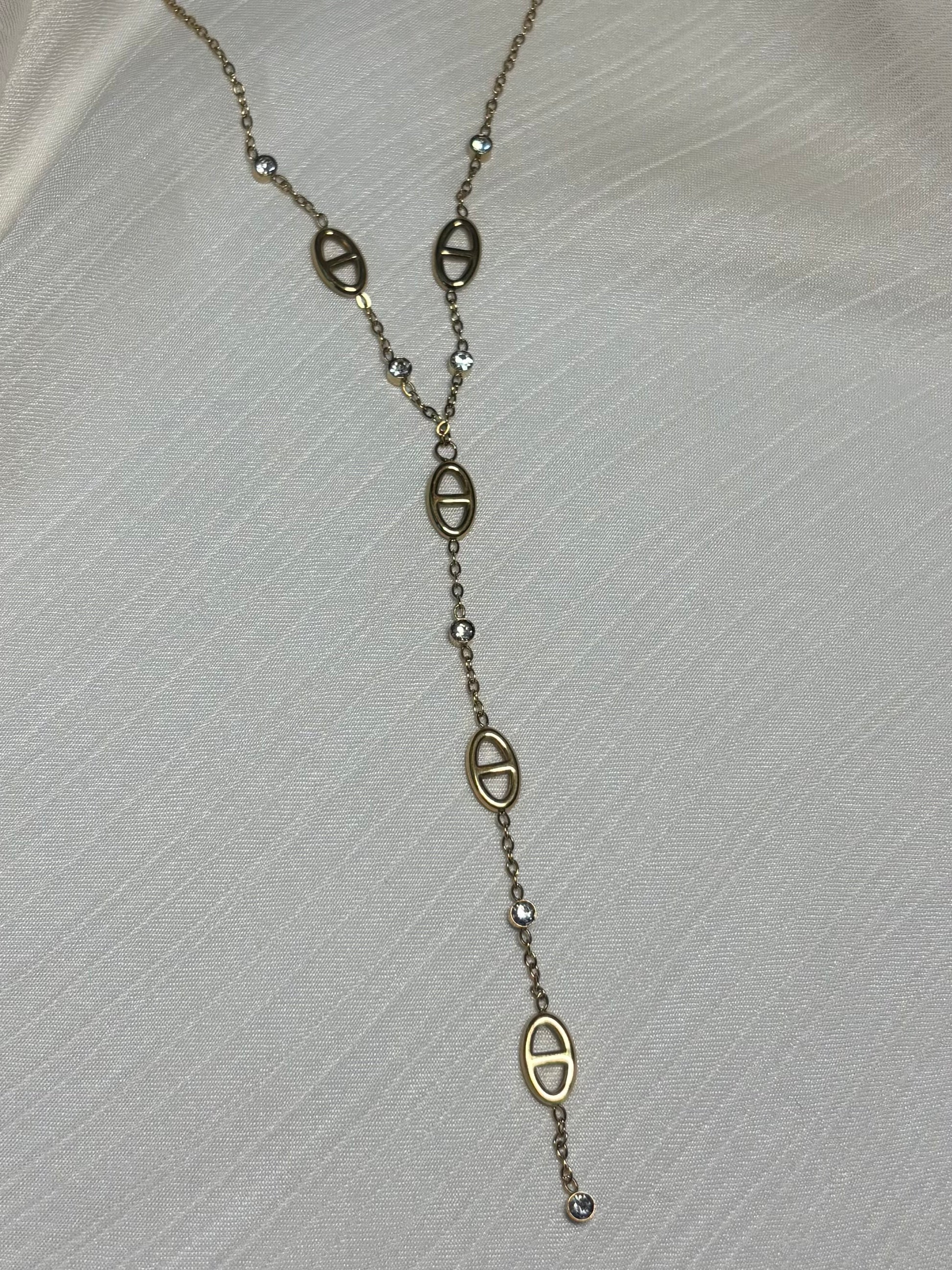 Ce collier en forme de Y est orné de strass scintillants qui captent la lumière à chaque mouvement. Le design comprend plusieurs éléments circulaires rappelant la maille marine, reliés par une fine chaine qui se prolonge en une goutte élégante. Les strass ajoutent une touche de glamour et de sophistication à ce collier.