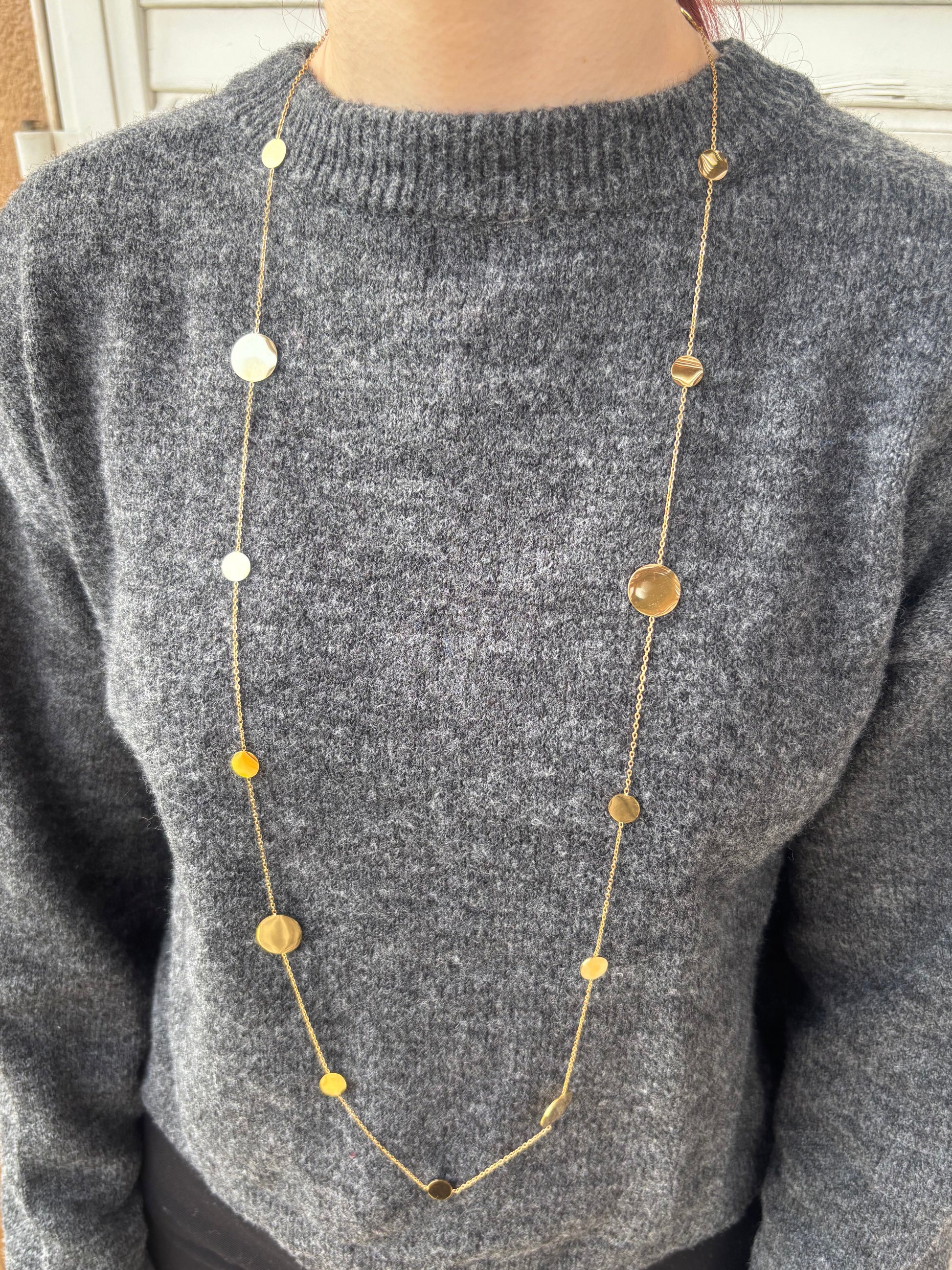 Ce collier long se porte aussi bien sur un pull, une chemise ou une robe, ajoutant une touche chic à votre look du quotidien comme à vos soirées.